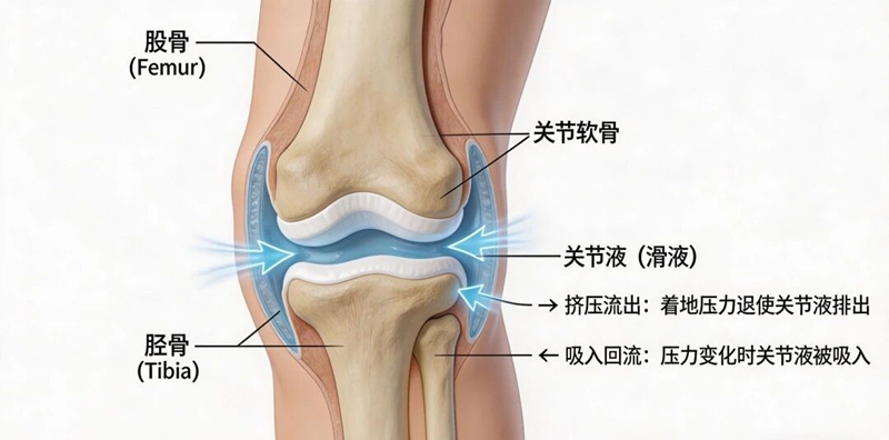 跑步时,膝盖的屈伸运动,就像一个运行的“生物泵”,能有效促进关节液循环,为软骨输送养分。同时关节液的流动还能起到润滑作用,减少软骨之间的摩擦。